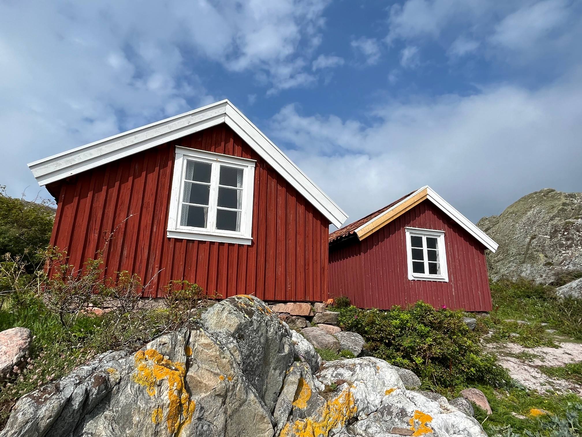 Den västra av de två små stugorna byggdes av min farmors farfars far Gabriel Sandmark och några av hans släktingar och vänner från öarna runt omkring. Den östra stugan byggdes av fiskare från Kalvö, Dyngö och Gåsö.